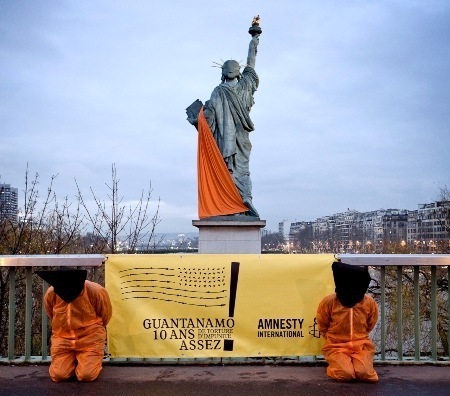 Plus tôt dans la journée, l’organisation a drapé la Statue de la liberté de Paris d’une bâche orange et plusieurs de ses membres ont revêtu la combinaison orange des prisonniers ainsi qu’une cagoule noire pour réclamer la fermeture sans délai du camp et des enquêtes contre les responsables des violations.