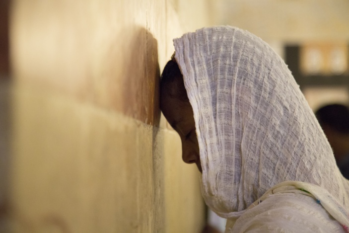 Musulmane en prière contre le cénotaphe de Rébecca dans la mosquée du caveau des Patriarches, Hébron, Palestine, 2014. (Photo : © MuCEM / IDEMEC / Manoël Pénicaud)
