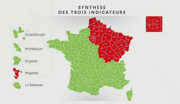 Pour y voir plus clair, fini les départements en orange. Désormais, ils sont en vert ou en rouge. La carte faisant le point sur la situation sanitaire en France (plus haut) a été présentée par le gouvernement dans le cadre de sa stratégie de déconfinement. La carte, qui fait la synthèse de trois indicateurs (circulation du virus, tension hospitalière et capacité en matière de tests virologiques), montre un « pays divisé en deux », selon les mots d'Edouard Philippe.