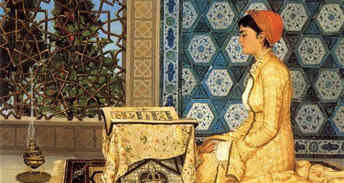 Une jeune femme lisant le Coran par le peintre turc Osman Hamdi Bey (Turquie, 1842-1910), vers 1880. Huile sur toile 41,1 x 51 cm Collection privée.