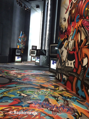 L’espace Arabic Sound System, constitué de vidéos d’interviews de rappeurs, dont El General, qui avait interpellé Ben Ali en 2010, mais aussi de très belles œuvres graphiques peintes in situ, est emblématique de ce foisonnement artistique du hip-hop arabe.