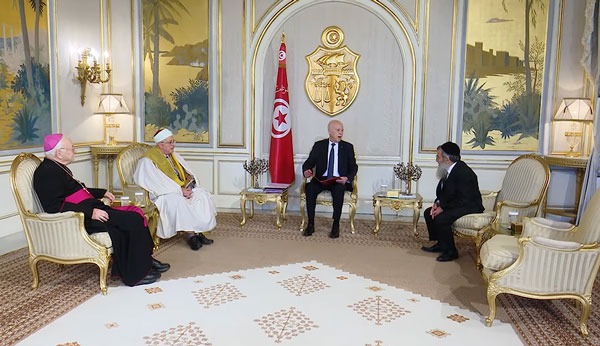 Près de dix jours après l’attaque perpétrée près de la synagogue de la Ghriba, sur l’île touristique de Djerba, le président Kaïs Saied a reçu, mercredi 17 mai, dans le palais de Carthage, le grand rabbin de Tunisie Haïm Bittan. Etaient présents pour l’occasion le mufti de la République Hichem Ben Mahmoud et l'archevêque de Tunis Ilario Antoniazzi.