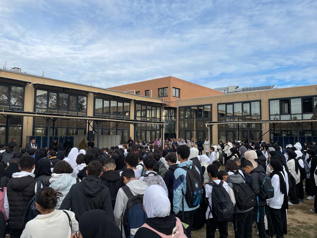 Elèves, enseignants, membres du personnel et de la direction du groupe scolaire Al-Kindi se sont recueillis en hommage à Samuel Paty et Dominique Bernard en octobre 2023. Le groupe scolaire musulman voit aujourd’hui ses contrats d’association avec l’Etat résiliés. © Al-Kindi