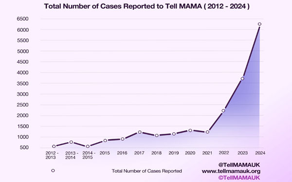 Sur les 6 313 actes antimusulmans enregistrés en 2024, l’association de lutte contre l’islamophobie a déclaré avoir pu en vérifier 5 837, constituant un record en 12 ans d’existence pour Tell Mama. Ce chiffre comprend 2 307 cas de discriminations, d’agressions et de violences verbales ou physiques (+ 34 %) et 3 630 cas de haine antimusulmane en ligne (+ 72 % par rapport à 2023). Sur ce point, Tell Mama souligne « le rôle des formes racialisées et stigmatisantes d'images générées par l'intelligence artificielle sur les communautés musulmanes ».