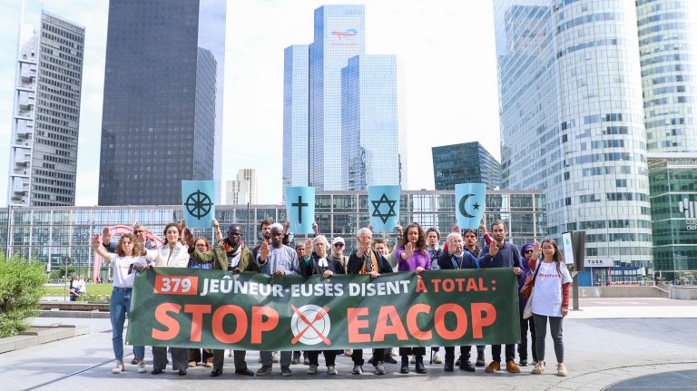 Des centaines de personnes se sont donné rendez-vous, vendredi 24 mai, dans le quartier de La Défense pour dénoncer les projets « climaticides » de TotalEnergies. La multinationale française, qui organisait ce jour-là une assemblée générale des actionnaires, a dû essuyer les protestations de très nombreux militants écologistes parmi lesquels se trouvaient des personnalités religieuses. Accompagnés d’une quinzaine de croyants issus de cinq traditions religieuses, elles ont accompli un « jeûne public d’interpellation » pour réclamer de nouveau l'abandon immédiat du projet d'Oléoduc de Pétrole Brut d'Afrique de l'Est (EACOP) entre l’Ouganda et la Tanzanie et du nouveau champ pétrolier Tilenga.