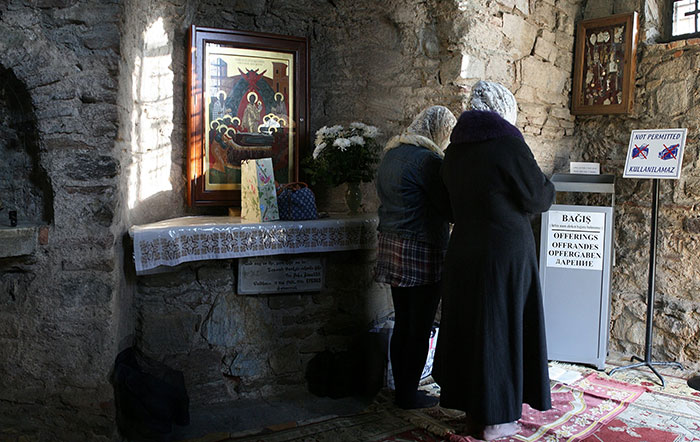 Des musulmanes priant dans le sanctuaire catholique de la Maison de Marie, à Ephèse, en Turquie. © Manoël Pénicaud