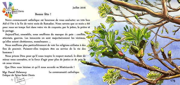 Notre communauté catholique est heureuse de vous souhaiter un très bon Aïd al-Fitr à la fin de votre mois de Ramadan. Nous savons que ce mois a été pour vous un temps fort dans votre vie de croyants, par le jeûne, la prière et le partage.