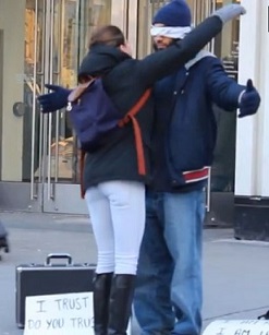 « Je suis un musulman, je suis considéré comme un terroriste », « Je vous fait confiance. Est-ce que vous me faites confiance? Faites-moi un câlin », peut-on lire sur des pancartes posées aux pieds de Mustafa Mawla, un jeune homme qui se tient debout, les yeux bandés et les bras ouverts, dans un quartier très fréquenté de Toronto, au Canada.