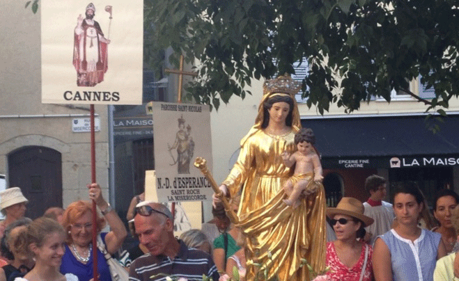 Entourant une statue de la vierge Marie, une procession religieuse, réunissant des enfants de chœur en robe, des représentants religieux, des fidèles rejoignait le Suquet pour une messe, place de la Castre.