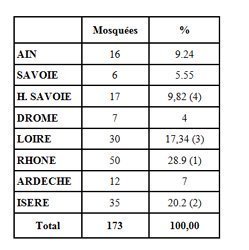 On dénombre environ 200 lieux de cultes musulmans dans la région Rhône Alpes dont une cinquantaine dans le département du Rhône (tableau 1). Ce sont essentiellement des salles de prières dont la superficie ne dépasse pas 150 m².
