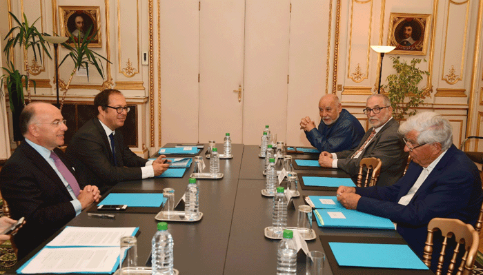 Lundi 29 août, le ministère de l'intérieur a organisé une "journée d'échanges et de consultations" à propos de la Fondation pour l'islam de France. De g. à dr. : Bernard Cazeneuve, ministre de l’Intérieur, Laurent Burin des Roziers, conseiller en charge des cultes auprès du ministre, Tahar Ben Jelloun, écrivain, Kamel Kabtane, recteur de la Grande Mosquée de Lyon, tous deux membres du conseil d’administration de la fondation, et Jean-Pierre Chevènement, ancien ministre et président de la Fondation pour l’islam de France. (photo © ministère de l’Intérieur)