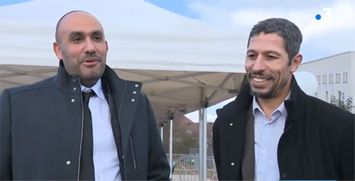 A Bussy-Saint-Georges, les présidents de la synagogue Yoan Cohen-Tannugi (à gauche) et de la mosquée Hicham Tahiri en février 2023 lors de la pose de la première pierre du lieu de culte juif. © Capture vidéo France 3