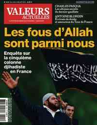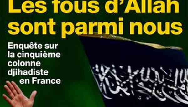 Dans sa Une en kiosque, l'hebdo titre « Les fous d’Allah sont parmi nous » en instillant clairement chez le lecteur la peur des ennemis de l'intérieur, présents en masse sur le territoire, à travers une « enquête sur la cinquième colonne jihadiste en France ». Sauf que la photo de couverture montrant un homme barbu de forte corpulence, visiblement fâché et arborant un drapeau noir et blanc avec des mots sacrés, n’est tout simplement pas français et la scène se passe bien loin du territoire national.
