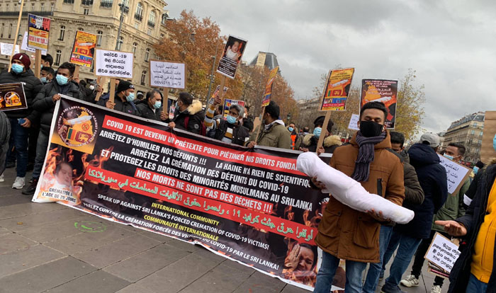 Une manifestation a été organisée à Paris en décembre 2020 pour protester contre l'incinération forcée des personnes contaminées par le Covid-19. © Ali Zahir Moulana / Twitter