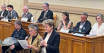 Le colloque a continué par l’intervention d’Alfonso Zardi, ancien membre du Conseil de l’Europe et délégué général de Pax Christi France, une ONG catholique, consultative auprès des institutions internationales de l’ONU et du Conseil de l’Europe. Pax Christi, fondée en 1945 sur le projet de la réconciliation franco-allemande, œuvre pour une culture de paix. Alfonso Zardi a rappelé ce miracle historique que fut la construction européenne ; miracle par son but d’assurer la paix par la prospérité commune des Etats qui la constituait, par la libre circulation des personnes et des biens en son sein. S’en sont suivis d’autres temps forts au cours de ce colloque. Hanna Assouline est fondatrice des Guerrières de la paix. Cette association de femmes de cultures différentes, des musulmanes et des juives en particulier, est porteuse d’un désir de paix, de justice et d’égalité entre les communautés.