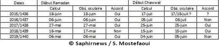 Cet échantillonnage montre qu’à l’exception du début du mois de Chawwal 2015 pour lequel il n’y a pas certitude (17 ou 18 juillet), les dates d’observation oculaire concernant les débuts des mois de Ramadan et de Chawwal sont connues de façon précise. D’autre part, dans 30 % des cas, il y a désaccord dans les dates entre les deux méthodes. A remarquer aussi qu’à l'exception de 2017, il n’y aurait pas d’accord complet pour une même année sur le début et la fin du mois du jeûne. Bien que minime, cet échantillonnage est suffisamment significatif pour montrer l’existence d’éventuelles divergences pour les années à venir.