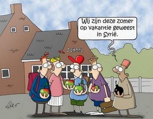 Le dessin (plus haut), publié dans De Gazet Van Antwerpen, montre un écolier présenté comme musulman, de retour de vacances de Syrie, dans une cour de récréation avec une bombe dans la main tandis que ses camarades ont en main une simple pomme.