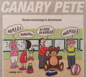 Avant lui, la caricature signée Canary Pete et publiée dans le quotidien néerlandophone Het Belang Van Limburg donne à voir un enfant de maternelle de Molenbeek, dans la région de Bruxelles, crier « Allahu akbaaaar » et prêt à trancher la gorge d'un ours en peluche, à côté d’enfants criant « maamaaa ».