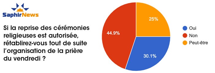 A la question « Jugez-vous le risque sanitaire trop grand pour ouvrir les lieux de culte avant le 2 juin ? », date à laquelle la phase 2 du déconfinement est actée, deux responsables de mosquées sondés sur trois (68,6 %) ont répondu « oui » contre 20,5 % « non ». 10,9 % ont choisi de ne pas se prononcer, préférant fort probablement laisser la réponse aux autorités sanitaires compétentes.