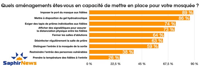 Ce constat nous amène tout droit à la prochaine question : pour permettre la reprise des cérémonies religieuses, « quels aménagements êtes-vous en capacité de mettre en place pour votre mosquée ? » Une très large majorité des responsables de mosquées indiquent pouvoir imposer le masque à leurs fidèles (89 %), mettre à disposition du gel hydroalcoolique à leurs fidèles (86 %), deux des conditions sine qua none à la reprise des offices religieux.