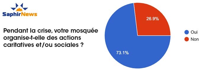 A noter enfin, 73,1 % des mosquées sondées ont pu organiser des actions caritatives et sociales durant ces derniers mois de crise sanitaire, faisant ainsi vivre les valeurs de solidarité, de partage et de fraternité, intrinsèques à l’islam. Il témoigne du rôle tout aussi social des lieux de culte au profit des personnes démunies de leur localité.