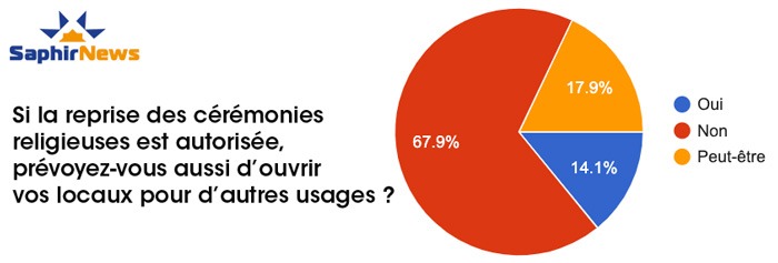 Au-delà de la reprise des prières, « prévoyez-vous d’ouvrir vos locaux pour d’autres usages (enseignement, conférences, activités culturelles, visites extérieures…) ? » Les responsables de mosquées répondent « non » à 68 %. Ceux qui ne se prononcent pas sont plus nombreux (17,9 %) que ceux qui répondent « oui » (14,1 %).