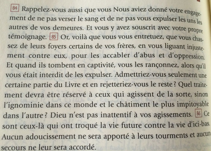 De plus, le Coran n’incite pas à tuer délibérément comme beaucoup de personnes « zemmourisés » le pensent (en référence à l’influence d’Éric Zemmour sur les auditeurs et lecteurs français). Il faut vérifier les textes pour comprendre que le Coran, bien au contraire, interdit et condamne à plusieurs reprises l’assassinat d’innocents : voir le Coran, s. 2 (Al-Baqara, La Vache), v. 84-85 ; s. 4 (An-Nisâ’, Les Femmes, v. 29-30, 92-93, 97 ; s. 5 (Al-Mâ’ida, La Table, v. 27-32 ; s. 6 (Al-Anʻâm, Les Bestiaux), v. 137, 140, 151.