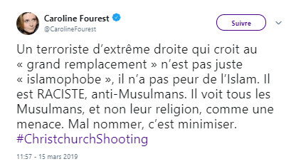 Après les attentats islamophobes de Christchurch qui ont endeuillé la Nouvelle-Zélande le 15 mars dernier, l’une des réactions les plus remarquables fut celle de Caroline Fourest. La polémiste féministe tweetait en effet une nouvelle salve contre le concept d’islamophobie, notion qu’elle combat avec d’autres intellectuels depuis de nombreuses années.