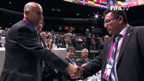 Le Palestinien Jibril Rajoub (gauche) et l'Israélien Ofer Eini se sont serré la main au congrès de la Fifa ce vendredi 29 mai après l’annonce de l’annulation du vote.