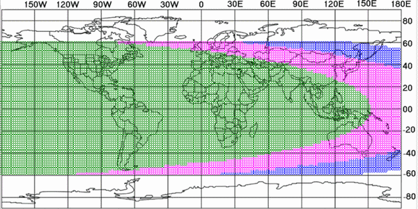 N.B. : Le nouveau croissant lunaire sera visible mardi 4 juin dans une majeure partie du monde comme en témoigne cette carte plus bas : à l’œil nu (zone verte), à l’œil nu ou à l'aide de télescopes selon si les conditions météorologiques sont bonnes ou non (zone magenta) ou à l'aide de télescope uniquement (zone bleue).