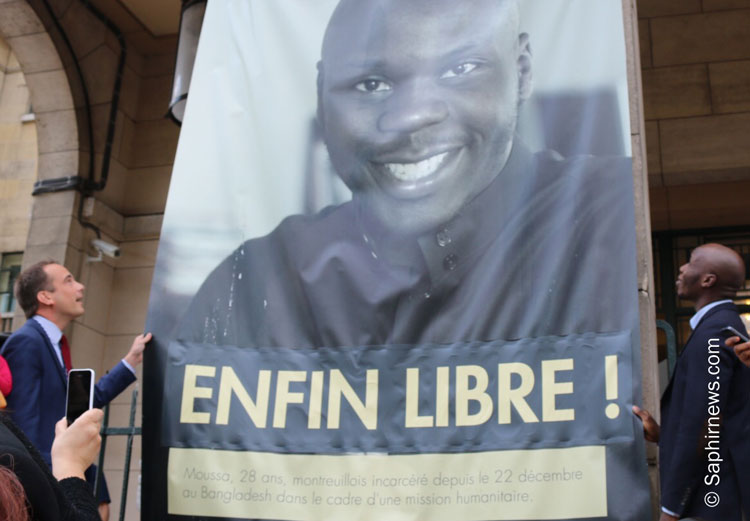 En revanche Fatiha Khettab, porte-parole du comité de soutien à Moussa, se fait plus diserte. Se présentant avec un tee-shirt de soutien au peuple rohingya, elle pointe les « polémiques complètement futiles et même dangereuses » alimentées par les « médias de masse ». « Je déplore également la faible mobilisation parlementaire : avec Razzy Hamadi (député de Montreuil) nous avons perdu énormément de temps à solliciter le soutien des députés et des sénateurs. C’est seulement après l’abandon des charges qu’une trentaine de députés ont signé l’appel à la libération de Moussa », ajoute-t-elle avant de remercier néanmoins le rôle des fonctionnaires du Quai d’Orsay.