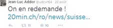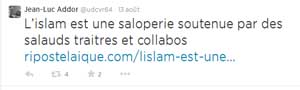 Assumant totalement ses idées racistes, il est prêt à rire de la mort de musulmans. Le 13 août dernier, l’homme s’était déjà fendu de commentaires islamophobes sur Twitter en retwittant un article du site Riposte laïque titré « L'islam est une saloperie soutenue par des salauds traîtres et collabos », rappelle la presse suisse.