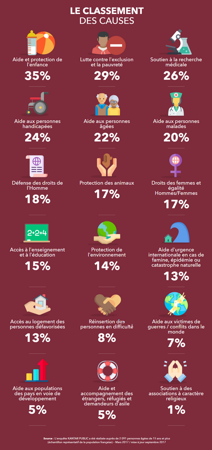 Un classement des causes les plus plébiscitées en France a également été réalisé (plus bas) par France Générosités. L’aide et la protection de l’enfance arrive en première position (35 %), suivi de la lutte contre l’exclusion et la pauvreté (29 %) puis de la recherche médicale (26 %). « Les jeunes (moins de 35 ans) sont particulièrement attentifs à l’actualité et aux causes urgentistes tandis que les plus de 50 ans sont sensibles à la protection des plus faibles », souligne l’étude.