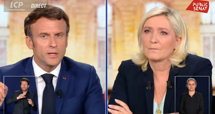 « Mme Le Pen, ce que vous dites est très grave. Je suis en train de vous dire que la France, patrie des Lumières, serait le premier pays au monde à interdire les signes religieux dans l'espace public », lui a répondu le président sortant, indiquant que sa mesure, en plus d'être « infaisable » pour des raisons constitutionnelles, est contraire au « respect de nos valeurs ».