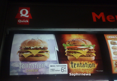 Dehors, devant le guichet Quick Drive, deux jeunes filles en voiture passent enfin leur commande : « Deux Tentations ! » Des menus bien nommés…