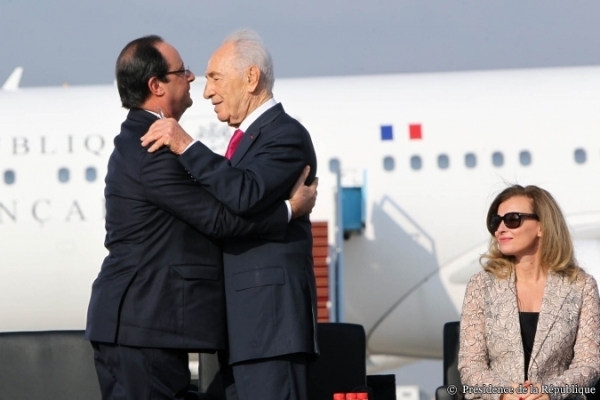 François Hollande aux bras du président israélien Shimon Pérès lors de son arrivée le 17 novembre en Israël en compagnie de Valérie Trierweiler.