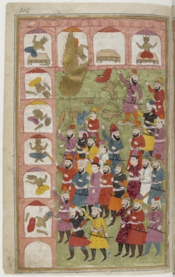 Le Prophète Muhammad, sous la forme d’un nimbe dorée (en haut à gauche de l’image), détruit les idoles de la Kaaba. Miniature du Cachemire, XIXe siècle (Paris, BnF, Manuscrits orientaux, Supplément persan 1030, fol. 306).