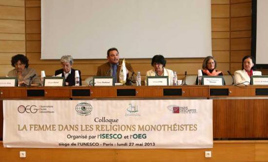 Organisé par l’Observatoire d’études géopolitiques (OEG), l'Organisation islamique pour l'Education, les Sciences et la Culture (ISESCO) ; le Centre Maurice Hauriou pour l’étude du droit public de la Faculté de droit Paris Descartes, le Centre Nord Sud du Conseil de l’Europe (CNS) et l’Association des femmes arabes de la presse et de la communication (Afacom), le colloque sur le thème « La femme dans les religions monothéistes » s’est tenu le 27 mai 2013 à l’UNESCO (Paris). Ce colloque a réuni un très nombreux public d’universitaires, de diplomates, d’experts et d’étudiants.
