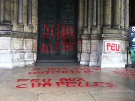 Plusieurs inscriptions ont été découvertes, mardi 18 mars, sur les murs et les piliers extérieurs de la Basilique du Sacré-Cœur de Montmartre, dans le 18e arrondissement de Paris. Sur la porte de l’édifice religieux, « Ni Dieu, ni maître, ni Etat » était inscrit à la peinture rouge. Même procédé pour le parvis sur lequel ont été taguées les expressions « A bas toute autorité » et « Feu aux chapelles ».