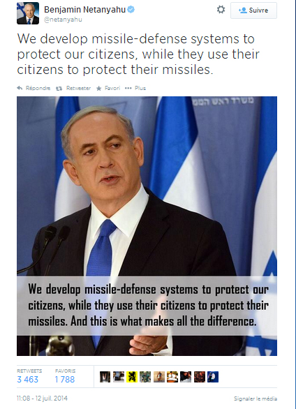 Twitt de Benjamin Netanyahu du 12 juillet 2014, typique de la propagande israélienne : « Nous déployons un système de défense antimissiles pour protéger nos citoyens, tandis qu'ils utilisent leur population pour protéger leurs missiles. »