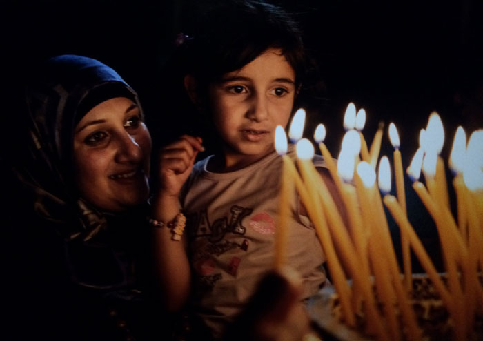 Musulmanes dans la basilique de la Nativité, à Bethléem (Palestine, 2014) : photo de Manoël Pénicaud, co-commissaire de l’exposition « Lieux saints partagés » qui se tient au musée de l’Histoire de l’immigration, à Paris, jusqu’au 21 janvier 2018.