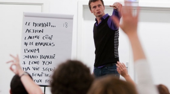 Sur la scène, le Suisse Yan Duyvendak et l’Egyptien Omar Ghayatt proposent au public un vote à main levée. Ils choisiront ainsi cinq saynètes parmi les onze développées par les deux artistes avec leur complice Nicole Borgeat.