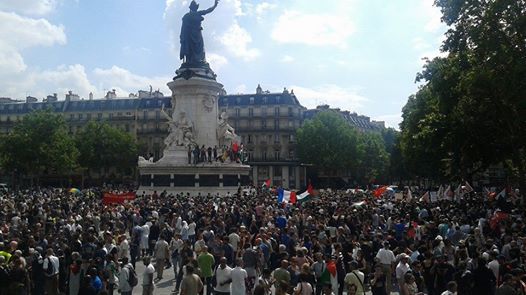 Plusieurs milliers de personnes - entre 5 et 10 000 selon les organisateurs - se sont rassemblées, samedi 26 juillet, à Paris, Place de la République, lieu d'où devait partir la manifestation de solidarité pour Gaza avant que la préfecture de police de Paris ne décide de son interdiction la veille, confirmée samedi par le Conseil d'Etat.