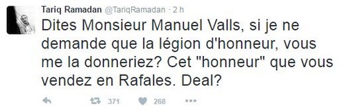 Quant à Tariq Ramadan, il s'est fendu d'un tweet dimanche 22 mai en fin de soirée, préférant tacler le Premier ministre pour les ventes d’armement par la France à des régimes dénoncés pour les multiples violations des droits de l’homme comme l’Egypte.