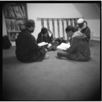 Mosquée Omar (11ème arrondissement), assis en tailleur, de jeunes adultes récitent le coran.