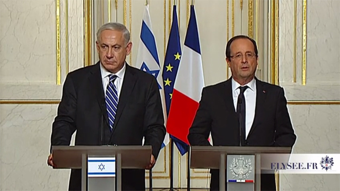 Le président François Hollande et le Premier ministre israélien Benjamin Netanyahou, lors de leur conférence de presse en octobre 2012, au cours de laquelle ils évoquaient « l'amitié liant les deux pays historiquement » et le prétendu « processus de paix entre Israéliens et Palestiniens ».