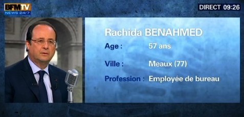 Quelques minutes avant la fin de son intervention sur les ondes de RMC et de BFM TV mardi 6 mai, François Hollande s'est vu interrogé par une auditrice sur la radicalisation des jeunes dans les quartiers sensibles. Rachida Benhamed, une auditrice pas tout à fait comme les autres : elle est en réalité une élue UMP, très proche de Jean-François Copé.