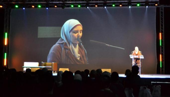 Lecture de la Déclaration commune à la tribune par Hafida Hammouti, au 1er Forum de la Foire musulmane de Bruxelles