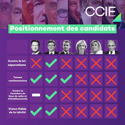 Dans une « grille de synthèse des positionnements » de six candidats (sur les 12 en lice) « en matière d'islamophobie » publiée mercredi 6 avril par le Collectif contre l'islamophobie en Europe (CCIE), héritier de l'ex-CCIF, Jean-Luc Mélenchon coche à toutes les cases. S'il partage, selon l'association, une « vision fidèle à la laïcité » et la défense de la liberté vestimentaire avec Yannick Jadot, il se démarque par son opposition affirmée à la loi séparatisme et à la fermeture des lieux de culte qui a émaillé le mandat. A noter qu'Emmanuel Macron ne coche à aucun des quatre critères choisis par le CCIE, à l'exception de sa position (libérale) sur les tenues vestimentaires.