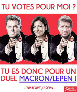 C’est que les messages culpabilisants se multiplient aussi sur les réseaux pour amener les électeurs de gauche à aller dans ce sens. « Tu votes pour moi ? Tu es donc pour un duel Macron/Le Pen », lit-on sur une image abondement partagée pointant expressément à l’index les soutiens de Fabien Roussel (PCF), Anne Hidalgo (PS) et Yannick Jadot (EELV) comme de supposés responsables d'un avenir politique morose pour la France.